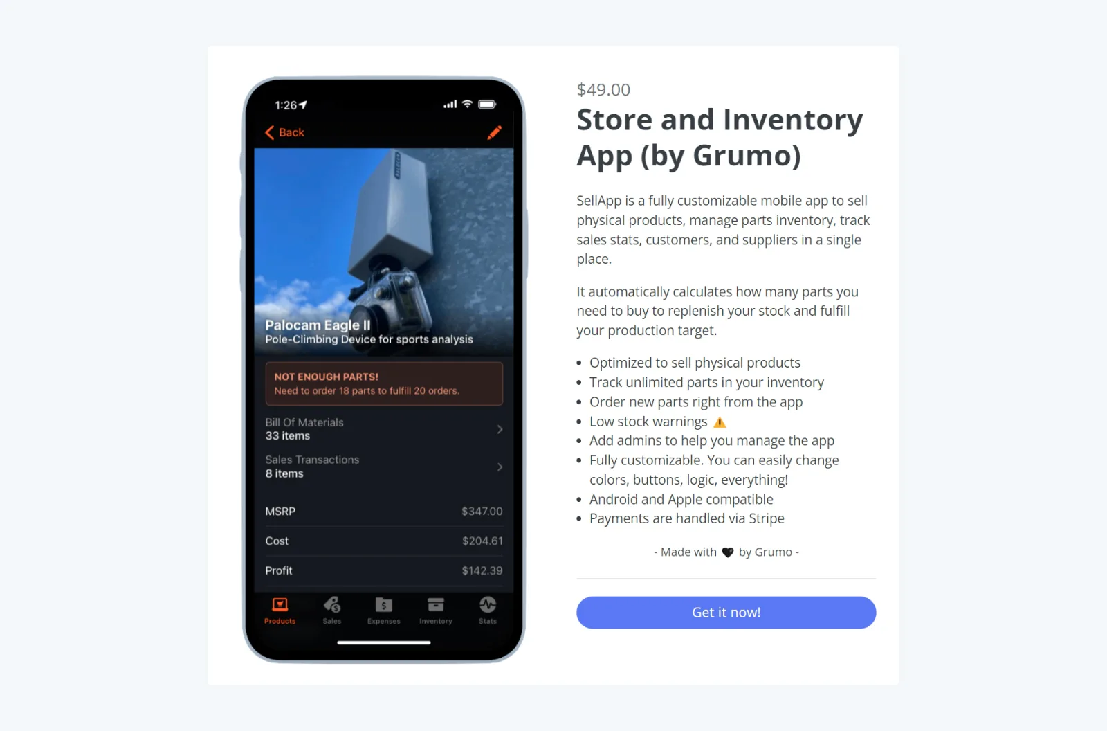 Grumo 由 Miguel Hernandez 創立,開發了一款幫助人們管理實體產品的應用程式。在 他的部落格中,Miguel 指出他使用一款名為 Glide 的無程式碼應用程式來建立他的應用程式。