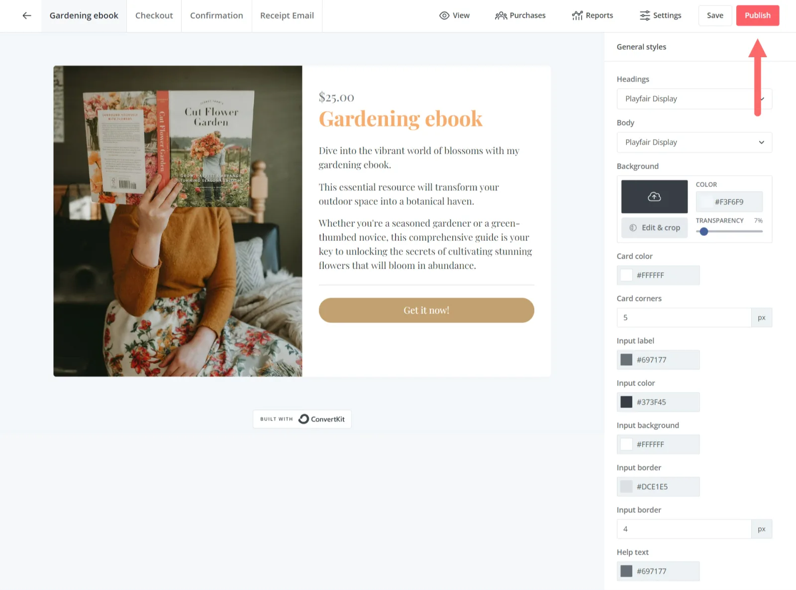 - 使用我們的視覺化建構器設計您產品的登陸頁面。完成後,點選「發布」。